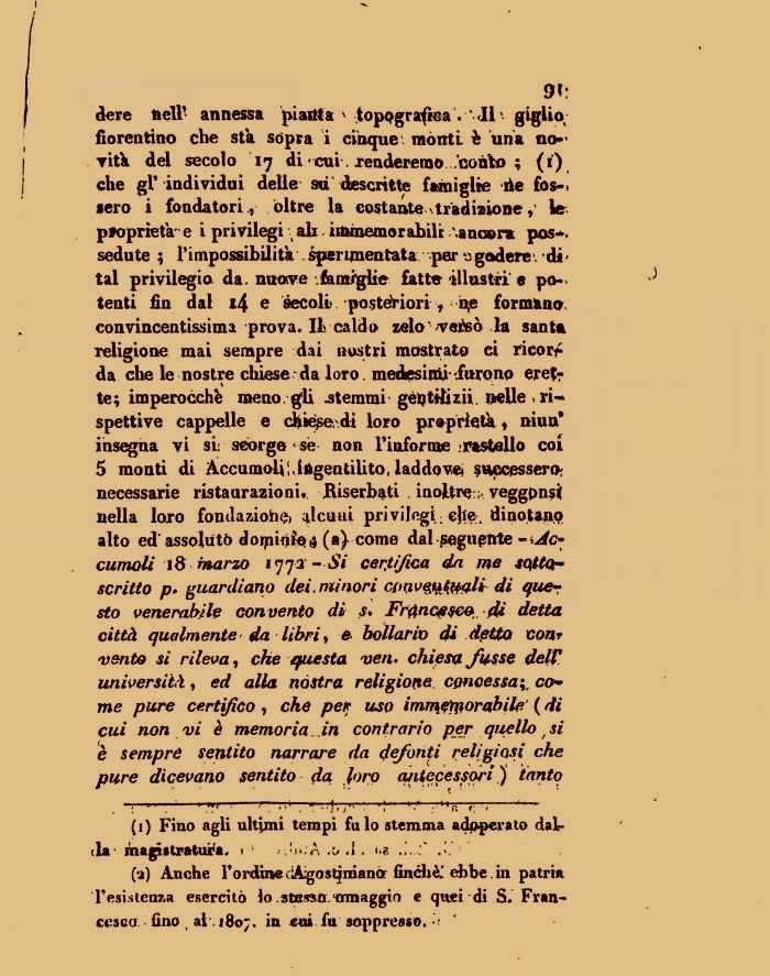 «fere fieli* annessa pianta * topografica. '<11 ' giglio; fiorentino cbe sta sopra i cinque', mónti è una no*' vitk del secolo 17 di • cui\ renderemo .conio ; (i) che gV individui delle sd descritte famiglie ile fossero i fondatori ., oltre la eostante \tradizionele proprietà- e i privilegi ab immemorabili; ancora pos-. sedute ; l'impossibilita sperimentata per ^godere di-tal privilegio, da. nuove .famiglie fatte illustri' e potenti fin dal 14 e secoli posteriori, n,e formano, convincentissima prova. IL caldo zelo veisò la santa religione mai sempre dai nostri mostrato ci ricorf da che le nostre chiese da loro , medesimi-'furono eret? te; imperocché meno, gli .stemmi gétytttuii. nelle .rispettive cappelle e chiede, di loro proprietà , niun* insegna vi si; scòrgo se non Filiforme rastello coi 5 monti di Accumoli:,ingentilito, laddove* successero; necessarie ristaurazioni. Biserbati inoltre ; veggpnsi nella loro fonilaziohe> alcuni privilegi-cjie4 dinotano alto ed assoluto doipin$04 (a) come dal seguente Accumoli 18 marzo 177$—Si certifica da me sottoscritto p. guardiano dei. minori cpqvqqJwI* di quer sto venerabile con vento di s. Francesco dì detta città qualmente da libri, e bollano di detto con? vento si rileva, che questa vèiu chiesa fusse dell' università , ed alla nòifra religione, concessa come pure certifico, che per uso immjeìi[iorabile ( di cui non vi è memoria in contrario per quello / si è sempre sentito narrare da defonti religiosi che pure dicevano sentito da foro antecessori ) tanto