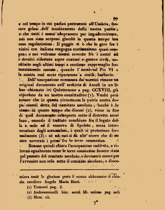 e nel tempo in cui palla si pertewente all'Umbria, fos* sero gelosi , dell' innalzaménto della ' nostra patti* y e\ che ; tutti i mezzi1 adoprassero per impadronirsene, nói non siùn sorpresi giacchi in questo tempo- brar cosa regolarissima . Il peggio si h che le gire fra i Ticini: con italiana vergogna tiontktìiafono quasi* sem* prfrs e noi vedremo essersi sovente ira 'v nostri èà i dorcini ridestate aspre contese1 e* guerre civiij, sostituite negli ultimi tepipi a continue rappresaglie for* tunataknente, cessale 7 quando l'immbrtal Pio VI « la nòstra real corte ripararono Ja simili y barbarie. ' :,, Dèli' Usurpazione commessa dai'norcini rimane un originai documento nell' archivio di Ascoli in unli-bso 'chiamato ivi Qulnfòrnone a pag. CCXVIII, già riportato dà un hostro concittadino (i). 'Vuoisi però notare che In questa circostanza fa patria nostra do-pta tessersi détta; de) -comitato ascolano ,'locchè fe .lo stello (in qnesto troppo* che diòcesi (2), viene in fine di quèfl documento; sottoposta sotto, il distretto asco-lano , essendo ri trattato conchiuso fra il legato della s. sede ed il veseovo di Spoleto , senza intervenzione degli acèumblesir L quali si protestano for* natalmente (3) : nfe ad; essisi dà altr' onore che di sère noverati i primi'fra lef terre sommatine. <« Rimane quindi chiara l'usurpazióne suddetta, e rilevasi egualmente tome le terre sommatine fossero state pel passato del comitato ascolano, è dovessero essere per l'avvenire non solo sotto il comitato ascolano, o dioco-