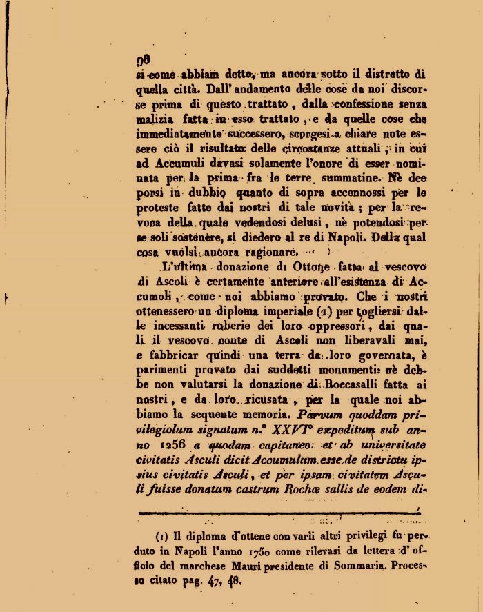 (i) Il diploma d'ottene con vani altri privilegi fa per* duto in Napoli l'anno 1750 come rilevasi da lettera :d* officio del marchese Mauri presidente di Sommaria. Pro cesto citato pag. 47, 48,