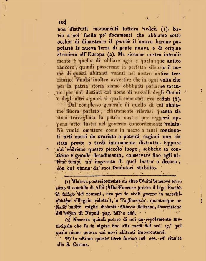 lióaf distratti monumenti tuttora 'Vedesi (i). Sa-Tia a noi facile pe* documenti che abbiamo sotto occhio di climóstrare il perche il nuòvo barone popolasse la: nuova terra di gente nuova e di origine •straniera all'Europa (2). Ma siccome nostro intendimento è quello di obliare ogni e qualunque antico rancore T quindi passeremo in perfetto silenzio il nome dì questi abitanti venuti nel nostro antico ter-»-ritorio. Vuoisi inoltre avvertire che in ogni volta che per la patria storia siamo obbligati parlarne saranno per noi distinti col nome di vassalli degli Orsini o degli altri signori ai quali sono stati essi caduti (3).