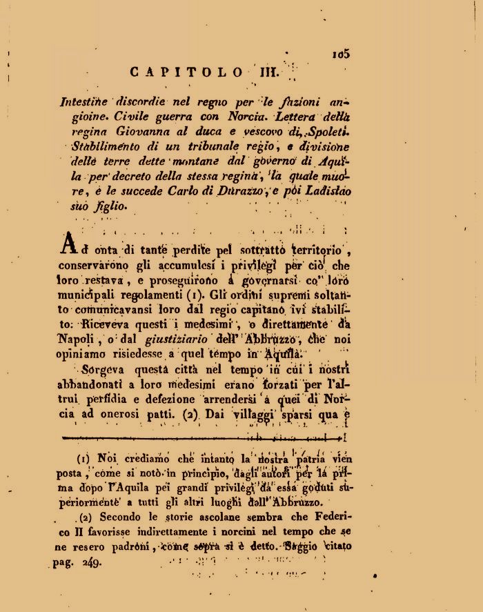 Intestile discordia nel regno per le Jhzioni angioine* Civile guerra con Norcia. Lettera deità regina Giovanna al duca e vescovo di,,Spole ti* Stàblliménto di un tribunale regio , e divisione dellè terre dette ' montane dal gòverno di Àquila per decreto della stessa regina, *là quale muore, è le succede Carlo di Diirazto , e pòi Ladislao suo figlio. : .