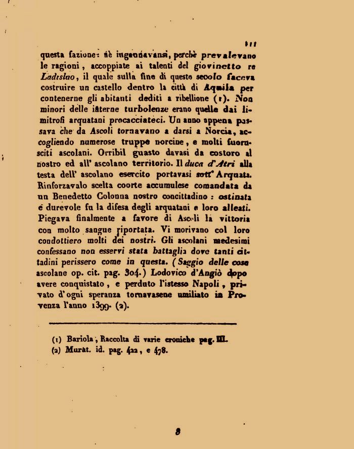 questa fazione: afe mgiunavansi, perchč prevalevano le ragioni, accoppiate ai talenti del giovinetto re Ladislao, il quale sulla fine di questo seoofo faceva costruire un castello dentro U cittk di Aqaiia per contenerne gli abitanti dediti a ribellione (v). Non minori delle iiterne turbolenze erano quelle dai limitrofi arquatani procacciateci. Un anno appeoa passava che da Ascoli tornavano a darsi a Norcia, accogliendo numerose truppe norcine, e molti Cuora-sciti ascolani. Orribil guasto davasi da costoro al nostro ed ali* ascolano territorio. Il duca d'Atri alla testa dell* ascolano esercito portavasi setr* Arguita. Rinforzatalo scelta coorte accumulese comandata da un Benedetto Colonna nostro concittadino : ostinata é durevole fu la difesa degli arquatani e loro alleati. Piegava finalmente a favore di Ascoli la vittoria con molto sangue Riportata. Vi morivano col loro condottiero molti dei nostri. Gli ascolani medesimi confessano non esservi stata battagli a dove tanti cit« tadini perissero come in questa. (Sąggio delle coso ascolane op. cit. pag. 3o4») Lodovico d'Angiņ <^>po avere conquistato , e perduto l'istesso Napoli , privato d'ogni speranza tornavasene umiliato in Provenza Vanno 1399. (a).