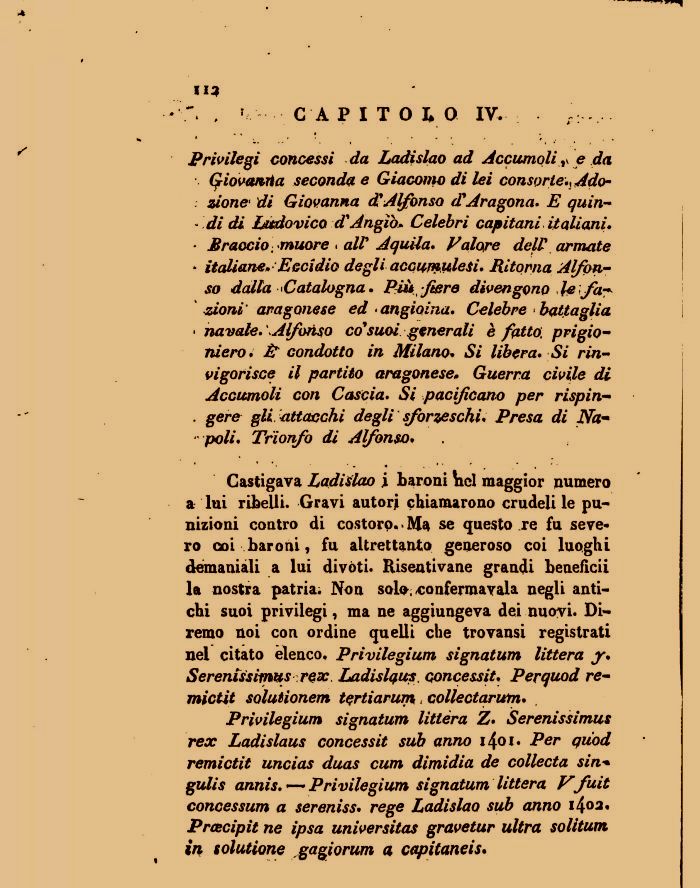 Privilegi concessi da Ladislao ad Accumoli e da (fiovaniia seconda e Giaconio di lei consorte., Adozione di Giovanna d'Alfonso d'Aragona. E quin-- di di Ludovico dAngìò* Celebri capitani italiani. ¦ Braccio, muore < all' Aquila. Valore dell' armate