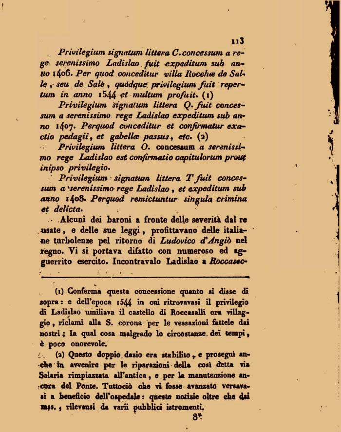 (i) Conferma questa concessione quanto si disse di sopra: e dell'epoca i544 in cui ritrovavasi il privilegio di Ladislao umiliava il castello di Roccasalli ora villaggio, ridami alla S. corona per le vessazioni fattele dai nostri ; la qual cosa malgrado le circostanze, dei tempi, è poco onorevole.