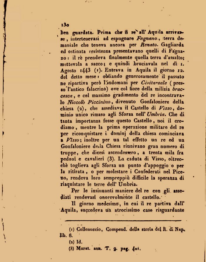 ben guardata. Prima che il recali* Aquila arriva»-se , iiiterteaevasi ad espugnare Frignano-, terra demaniale che teneva ancora per Renato. Gagliarda ed ostinata resistenza presentavano quelli di Fa'gna-no : il rè prendeva finalmente quella terra d'assalto; mettevala a sacco; e quindi bruciavala nel di i. Agosto i443 (')• Entrava in Aquila il giorno 12. dei detto mese t obliando generosamente il passato Ite ripartiva però Indomani per Civitareale ( pres* so l'antico falacrinò) ove col fiore della milizia brac cesca, e col massimo gradimento del re incontrava-lo Niccolò Piccinino y divenuto Gonfaloniere della chiesa (a), che assediava il Castello di Fisso, dominio unico rimaso agli Sforza nell' Umbria? Che di tanta importanza fosse questo Castello, noi il crediamo , mentre la prima operazione militare del re per riconquistare i dominj della chiesa cominciava a Fìsso; inoltre per un tal effetto un re ed un Gonfaloniere deila Chiesa riunivano gran numero di truppe, che dicesi ascendessero, a trenta mila fra pedoni e cavalieri (3). La caduta di Visso, oltrec-chè toglieva agli Sforza un punto d'appoggio o per la ritirata , o per molestare i Confederati nel Piceno, rendeva loro sempreppiù difficile la speranza di riaquistare le terre dell' Umbria.