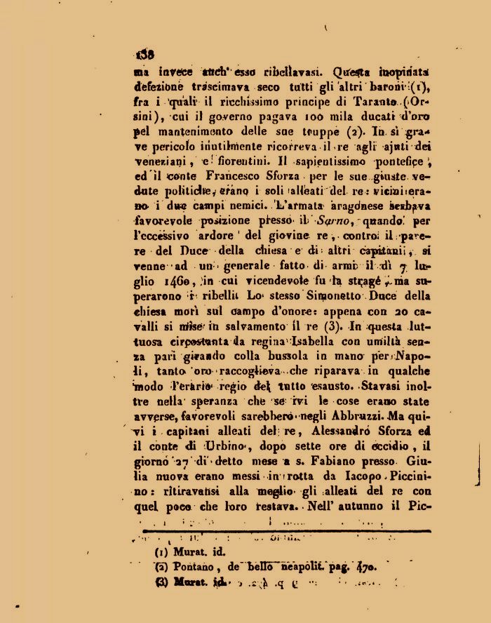 mi invece anch'esso ribellavasi. Questa inopinata! defezione trascimava seco tutti gli altri baroni'(i), fra i 'quali' il ricchissimo principe di Tarante..(>Or* sini), cui il governo pagava ioò mila ducati d'oro pel mantenimento delle sne truppe (2). In sì :gra* ve pericolo inutilmente ricorreva il re agli- ajnti dei veneziani, e * fiorentini. Il sapientissimo pontefice J, ed il conte Francesco Sforza per le sue giuste ve-? dnte politidtòy erano i soli 'alleati del re : vicinitera* no- i dwe campi nemici. .'L'armata^ aragdnese àesbjiva favorevole posizione plesso \V Syrno, quando' per l'eccessivo ardore' del giovine re , contro; il/parere del Duce della cliiesa e di ; altri capiianii, si venne ad un< generale fatto- di armb il ndì 7; lus-glio 1460, ;in cui vicendevole fu la stijagé ^ma superarono r ribellii Lo» stesso Simonetta Duce della chiesa morì sul campo d'onore e appena con 20 cavalli si ittfse'in salvamento il re (3). In questa luttuosa cirpo^tnnta 4a regina''Isabella con umiltà senza pari girando colla bussola in mano per ( Napoli, tanta'oro-raccoglieva che riparava in qualche imodo l'erario1 regio de\ tutto esausto.-Stavasi inoltre nella' speranza che se irvi le cose eratso state avverse, favorevoli sarebbero* negli Abbruzzi. Ma quivi i capitani alleati deli re, Alessandro Sforza ed il conte di Urbino*, dopo sette ore di eccidio, il giorno '27' di'«detto mese a s. Fabiano presso Giulia nuova erano messi in ? rotta da Iacopo. Piccinino : rltiravattsi alla meglio- gli ^alleati del re con quel poco che loro testava. - Neil'autunno il Pic-