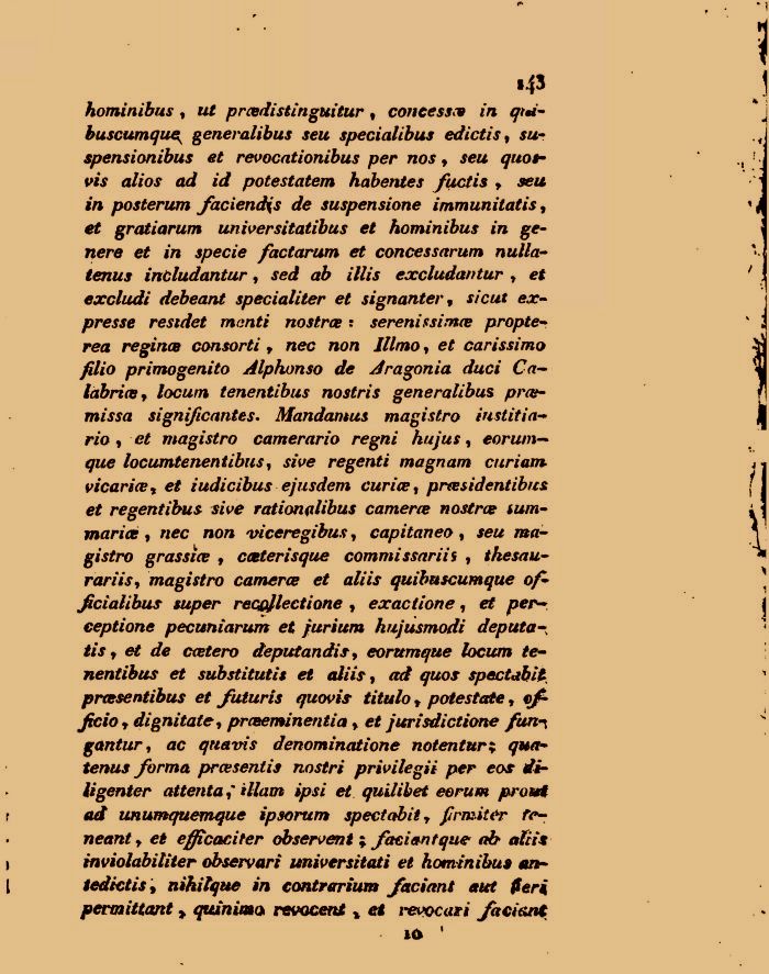 hominibus, ut prcedistinguitur % concessa» in qt*-buscumque{ generalibus seu specialibus edictìs, su-spensionibus et revocationibus per nos, seu quot-vis alios ad id potestatem habentes fuctis , seu in posterum faciend\s de suspensione immunitatis, et gratiarum universitatibus et hominibus in genere et in specie factarum et concessarum nulla-tenus indudantur, sed ab illis excludantur > et excludi debeant specialiter et signanter, si cut ex-presse residet manti nostra; : serenissima propte-rea regince consorti f nec non Illmo, et carissimo jìlio primogenito Alphonso de Aragonia duci Calabria, locum tenentibus nostris generalibus pra-mi ssa significantes. Mandantus magistro institi a-rio , et magistro camerario regni hujus, eorum— que locumtenen tibus, «Ve regenti magnam curiam vicarice, e* iudicibus ejusdem curia, prasidentibrcs et regentibus sive rationalibus camera nostra sum-maria, «ec no» viceregibus, capitaneo, seu magistro grassìa , caterisque commi ssari i 9 , thesau-rariis, magistro camera et aliis quibuscumque of* ficialibus super recoflectione , exaction e, et per-, eeptione pecuniarum et furium hujùsmodi deputa-tis, e* de catero deputandis, eorumque locum tenentibus et substitutis et aliis, quos spectabit prasentibus et futuris quovis titulo r potestate, Jicioy dignitate, praeminentia > e/ jurisdictione /uni gantur, ac quattis denominatane notenturi qua-tenus forma prasentis nostri privilegit per eos di-li gen ter attentatllam ipsi et quilibet eorum provi ad unumquemque ipsorum spectabit y frniiter te-neanty et efficaci ter óbservent ; faciantque ab aliit tnviolabiliter observari universitati et hominibus art-tedictis, nihiìque in contrarium faciant aut fieri pevmittant > quiniaw revocent % et revocati faciant