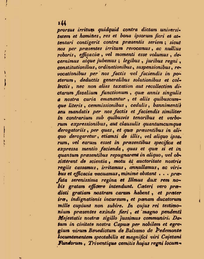 rtfgwx cassamus, irritamus, annullamus, ac wW« ci efficacia vacuamus, minime obstant ? . , /me-^/«/a serenissima regina et Illmus ditx rem no-&V gratam effimere intendunU Cceteri vero prce-«fr'olt gratiam nostram carnai habent, prafter ircef indignationis incursum , posnam ducatorum mille cupiunt non subire? /« cm/uj re*' testimoni um prcesentes exinde fieri, e* *magno pendenti Majestatis nostra sigillo jussimus communirU Da* tum in civitate nostra Capute per nobilem et egre+ gium virum Benedictum de Balsamo de Pedemonte locumtenenlem spectabilis et magnifici viri Cajetani Fundorum, Triventique cornitis hujus regni locum*