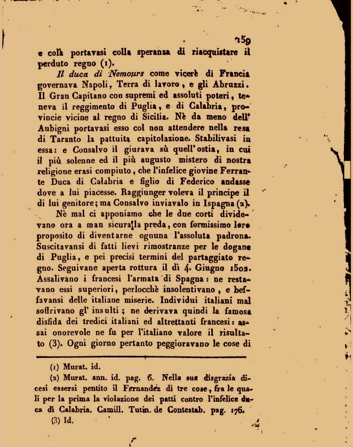 Il duca di Nemours come viceré di Francia governava Napoli, Terra di lavoro, e gli Abruzzi. Il Gran Capitano con supremi ed assoluti poteri, te* neva il reggimento di Puglia, e di Calabria, Provincie vicine al regno di Sicilia. Ni da meno dell? Aubigni portavasi esso col non attendere nella resa di Taranto la pattuita capitolazione. Stabilivasi in essa: e Consalvo il giurava sù quell'ostia, in cui il più solenne ed il più augusto mistero di nostra religione erasi compiuto, che l'infelice giovine Ferrante Duca di Calabria e figlio di Federico andasse dove a lui piacesse. Raggiunger voleva il principe il di lui genitore; ma Consalvo inviavalo in Ispagna(a)*