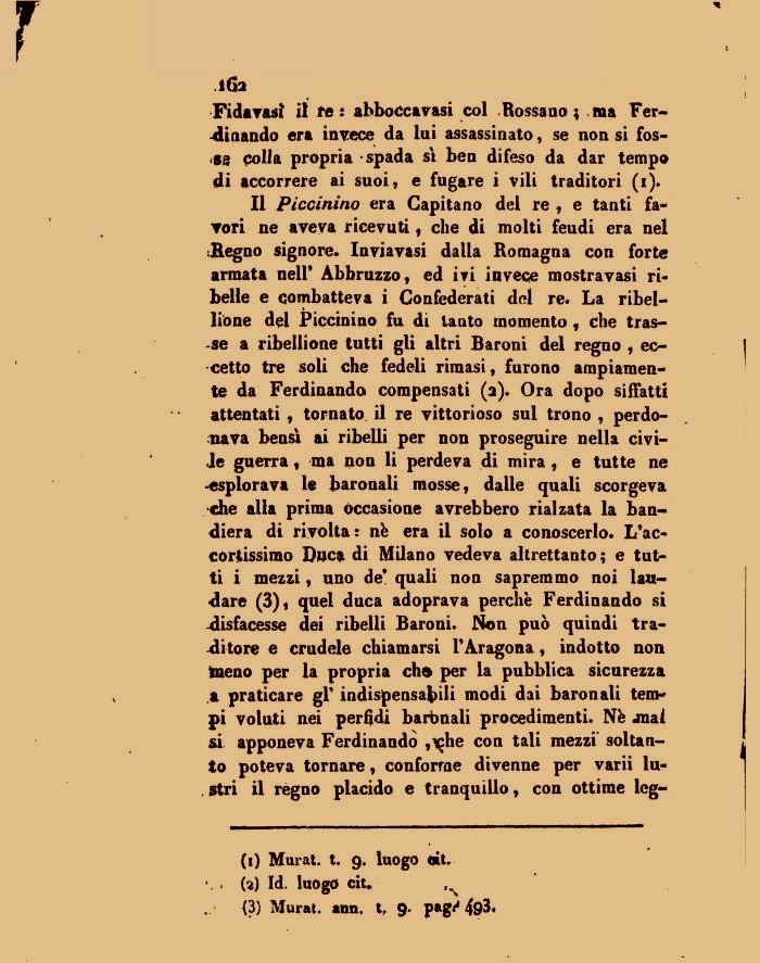 Il Piccinino era Capitano del re , e tanti favori ne aveva ricevuti, che di molti feudi era nel Jìeguo signore. Inviavasi dalla Romagna con forte armata nell' Abbruzzo, ed ivi invece mostravasi ribelle e combatteva i Confederati del re. La ribellione del Piccinino fu di tanto momento, che trasse a ribellione tutti gli altri Baroni del regno , eccetto tre soli che fedeli rimasi, furono ampiamente da Ferdinando compensati (a). Ora dopo siffatti attentati , tornato il re vittorioso sul trono , perdonava bensì ai ribelli per non proseguire nella civile guerra, ma non li perdeva di mira, e tutte ne •esplorava le baronali mosse, dalle quali scorgeva •die alla prima Occasione avrebbero rialzata la bandiera di rivolta: né era il solo a conoscerlo. L'accortissimo Duca di Milano vedeva altrettanto ; e tutti i mezzi, uno de* quali non sapremmo noi laudare (3), quel duca adoprava perchè Ferdinando si ¦disfacesse dei ribelli Baroni. Non può quindi traditore e crudele chiamarsi l'Aragona, indotto non meno per la propria eh® per la pubblica sicurezza a praticare gì' indispensabili modi dai baronali tem-pi voluti nei perfidi baronali procedimenti. Nè «mai si apponeva Ferdinando ,^he con tali mezzi' soltanto poteva tornare, conforme divenne per varii lustri il regno placido e tranquillo, con ottime leg-