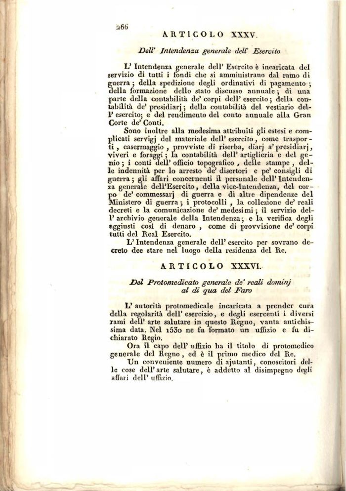 L' Intendenza generale dell' Esercito č incaricata del servizio di tutti i fondi che si amministrano dal ramo di guerra ; della spedizione degli ordinativi di pagamento ; della formazione dello stato discusso annuale -, di una parte della conlabilitā de' corpi dell' esercito ; della contabilitā de' presidiarj ; della contabilitā del vestiario dell' esercito; e del rendimento del conto annuale alla Gran Corte de' Conti.