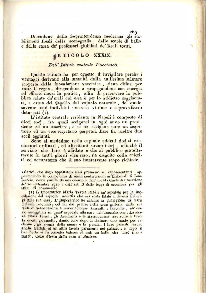 Questo istituto ha per oggetto d' invigilare perchè i vantaggi derivanti alla umanità dalla utilissima salutare scoperta della inoculazione vaccinica , siano diffusi per tutto il regno , dirigendone e propagandone con energia ed efficaci mezzi la pratica , ailin di preservare la pubblica salute da'mali cui essa è per lo addietro soggiaciuta, a causa del flagello dal vajuolo naturale , del quale-sovente tanti individui rimasero vittime e sopravvissero deturpati (1).