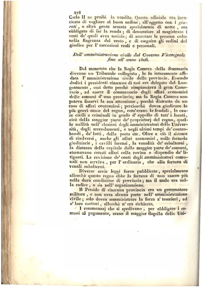 Dal momento clic la Regia Camera della Sommaria divenne 1111 Tribunale collegiata , le fu interamente affidata l'amministrazione civile delle provincie. Essendo dodici i presidenti ciascuno di essi era delegalo dal Luogotenente , così detto perchè rimpiazzava ii gran Camerario , ad essere il cornmcssario degli affari economici delle comuni d' una provincia; ma la Picgia Camera non poteva fissarvi la sua attenzione , perchè distrutta da un caos di affari contenziosi ; perciocché dovea giudicare le più gravi cause del regno, com'erano le feudali , le cause civili e criminali in grado d' appello di tuli' i locati, cioè della maggior parte de' proprictarj del regno, quelle nullità neli' elezioni digli amministratori delle Università, degli arrcndamenti, e negli ultimi tempi de'contro-bandi , de' lotti , della posta ctc. Oltre a ciò il sistema di risolversi, anche gli all'ari economici , colle forinole giudiziarie , i cavilli forensi, la venalità de' subalterni , la distanza della capitale dalla maggior parte de'comuni, eternavano cotesti all'ari colla rovina e dispendio de' litiganti. La revisione de'conti degli amministratori comunali non serviva , per 1' ordinario , chc alla fortuna di venali subalterni.