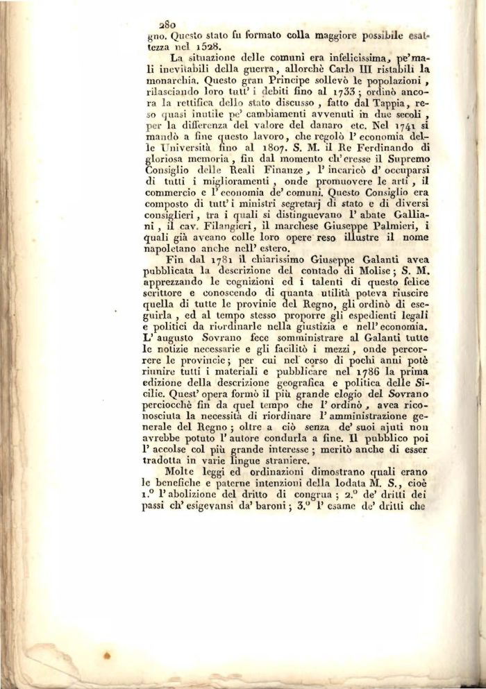 Fin dal 1781 il chiarissimo Giuseppe Galanti avea pubblicata la descrizione del contado di Molise ; S. M. apprezzando le cognizioni ed i talenti di questo felice scrittore e conoscendo di quanta utilità poteva riuscire quella di tutlc le provinie del Regno, gli ordinò di eseguirla , ed al tempo stesso proporre gli espedienti legali e politici da riordinarle nella giustizia e nell'economia. L' augusto Sovrano lece somministrare al Galanti tulle le notizie necessarie e gli facilitò i mezzi, onde percorrere le provincie ; per cui nel corso di pochi anni potò riunire tutti i materiali e pubblicare nel 1786 la prima edizione della descrizione geografica e politica delle Sicilie. Quest'opera formò il più grande elogio del Sovrano perciocché fili da quel tempo che I' ordinò , avea riconosciuta la necessità di riordinare 1' amministrazione generale del Regno ; oltre a ciò senza de' suoi ajuti non avrebbe potuto 1' autore condurla a fine. Il pubblico poi 1' accolse col più grande interesse ; meritò anche di esser tradotta in varie lingue straniere.