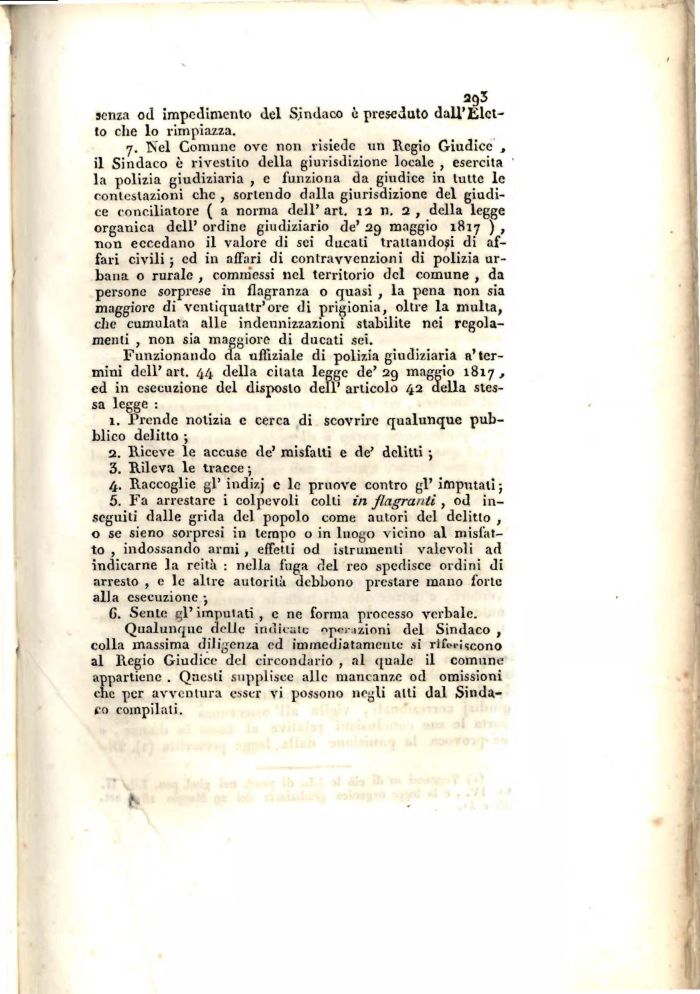 7. Nel Connine ove non risiede un Regio Giudice , il Sindaco č rivestilo della giurisdizione locale , esercita la polizia giudiziaria , e funziona da giudice in lutto le contestazioni che , sortendo dalla giurisdizione del giudice conciliatore ( a norma dell'art. 12 n. 2, della legge organica dell' ordine giudiziario de' 29 maggio 1817 ) , non eccedano il valore di sei ducali trattandoci di affari civili ; ed in affari di contravvenzioni di polizia urbana o rurale , commessi nel territorio del comune , da persone sorprese in flagranza o quasi , la pena non sia maggiore di venliquattr'ore di prigionia, oltre la multa, che cumulata alle indennizzazioni stabilite nei regolamenti , non sia maggiore di ducati sci.