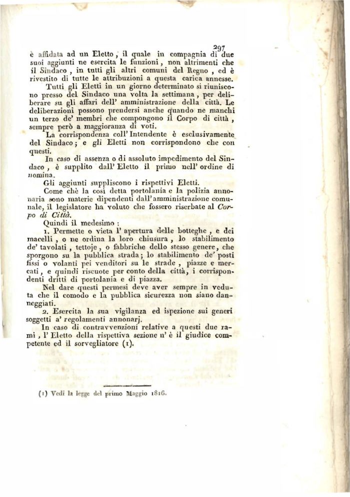 Tutti gli Eletti in un giorno detcrminato si riuniscono presso del Sindaco una volta la settimana , per deliberare su gli aifari dell' amministrazione della città. Le deliberazioni possono prendersi anche quando ne manchi un terzo de' membri che compongono il Corpo di città , sempre però a maggioranza di voti.
