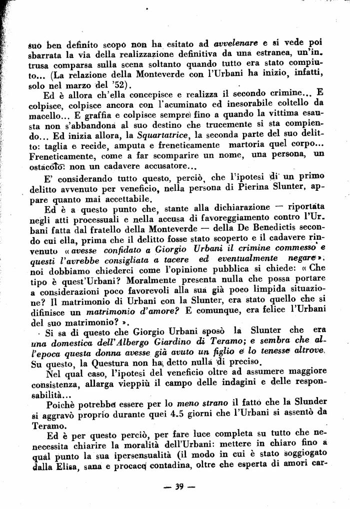Ed è a questo punto che, stante alla dichiarazione — riportata negli atti processuali e nella accusa di favoreggiamento contro PUr. bani fatta dal fratello della Monteverde — della De Benedictis secondo cui ella, prima che il delitto fosse stato scoperto e il cadavere rinvenuto « avesse confidato a Giorgio Urbani il crimine commesso e questi l'avrebbe consigliata a tacere ed eventualmente negare*». noi dobbiamo chiederci come l'opinione pubblica si chiede: « Che tipo è quest'Urbani? Moralmente presenta nulla che possa portare a considerazioni poco favorevoli alla sua già poco limpida situazione? Il matrimonio di Urbani con la Slunter, era stato quello che si difinisce un matrimonio d'amore? E comunque, era felice l'Urbani del suo matrimonio? ».