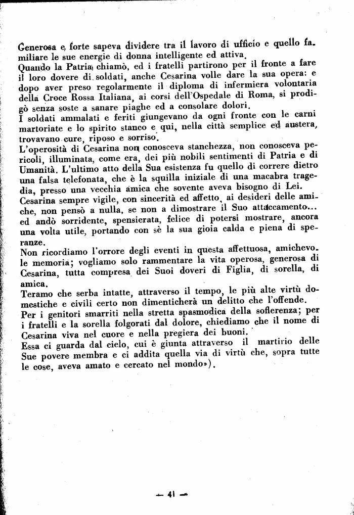 L'operosità di Cesarina non; conosceva stanchezza, non conosceva pericoli, illuminata, come era, dei più nobili sentimenti di Patria e di Umanità. L'ultimo atto della Sua esistenza fu quello di correre dietro una falsa telefonata, che è la squilla iniziale di una macabra tragedia, presso una vecchia amica che sovente aveva bisogno di Lei. Cesarina sempre vigile, con sincerità ed affetto, ai desideri delle amiche, non pensò a nulla, se non a dimostrare il Suo attaccamento... ed andò sorridente, spensierata, felice di potersi mostrare, ancora una volta utile, portando con sé la sua gioia calda e piena di speranze.