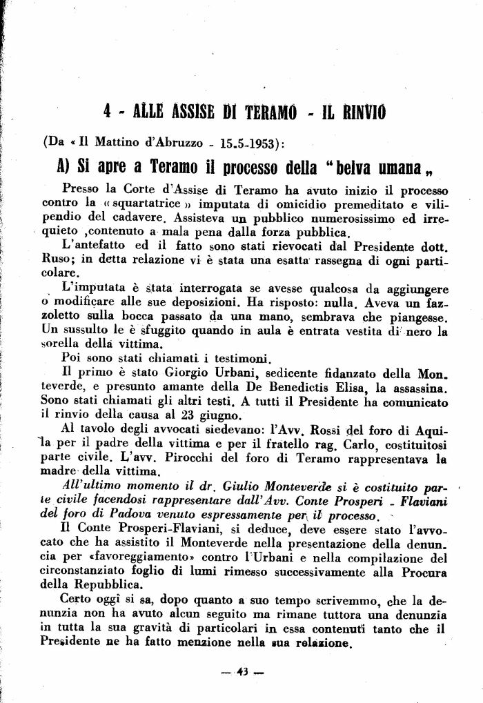 Presso la Corte d'Assise di Teramo ha avuto inizio il processo contro la « squartatrice » imputata di omicidio premeditato e vilipendio del cadavere. Assisteva un pubblico numerosissimo ed irrequieto ,contenuto a mala pena dalla forza pubblica.