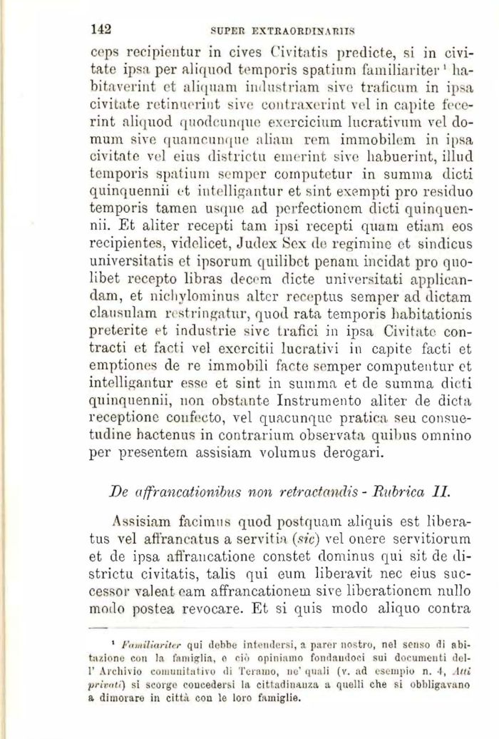 1 Familiariter qui clcbbe intendersi, a parer nostro, nel senso di abitazione con la famiglia, o ciò opiniamo fondandoci sui documenti dell' Archivio coinunitativo di Teramo, ne' quali (v. ad esempio n. 4, Atti privati) si scorge concedersi la cittadinanza a quelli che si obbligavano a dimorare in città con le loro famiglie.