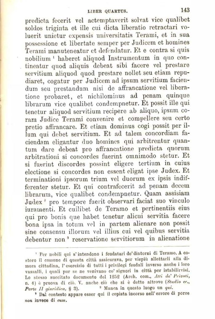 ' Per nobili qui s'intendono i feudatari de'dintorni di Teramo. A costoro il coinnne di questa città assicurava, per viepiù allettarli alla dimora cittadina, l'esercizio di tulli i privilegi feudali inverso anche i loro vassalli, i quali pur se ne venivano co' signori ili città per istabilirvisi. 1,0 stesso succitato documento del 1252 (Arch. coni., Atti de' Privali, n. t) è pruova di ciò. V. anche ciò che si è detto altrove (Studio ce., Parie 11 giuridica, § 3). * Slanca in questo luogo un qui.