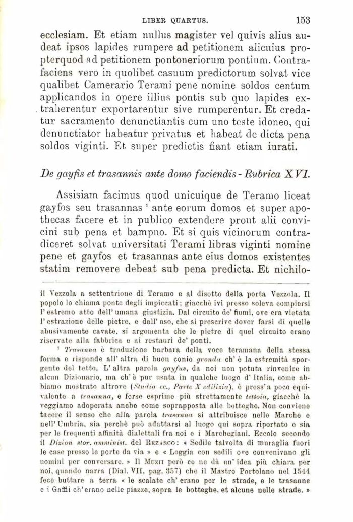 Assisiam facimus quod unicuique de Teramo liceat gayfos seu trasannas 1 ante eorum domos et super apo-thecas faeere et in publico extendere prout alii convicini sub pena et bampno. Et si quis vicinorum contra-diceret solvat universitati Terami libras viginti nomine pene et gayfos et trasannas ante eius domos existentes statini removere debeat sub pena predicta. Et nichilo-