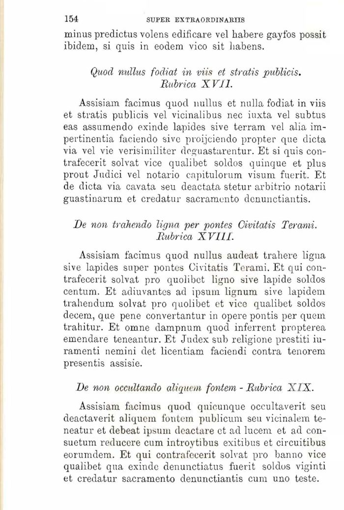 Assisiam facimus quod nullus audeat trahere ligna sive lapides super pontes Civitatis Terami. Et qui contrafecerit solvat prņ quolibet ligno sive lapide soldos centum. Et adiuvantcs ad ipsum lignum sive lapidem trahendum solvat prņ quolibet et vice qualibet soldos decem, que pene convertantur in opere pontis per quern trahitur. Et omne dampnum quod inferrent propterea emendare teneantur. Et Judex sub religione prestiti iu-ramenti nemini det licentiam faciendi contra tenorem presentis assisie.