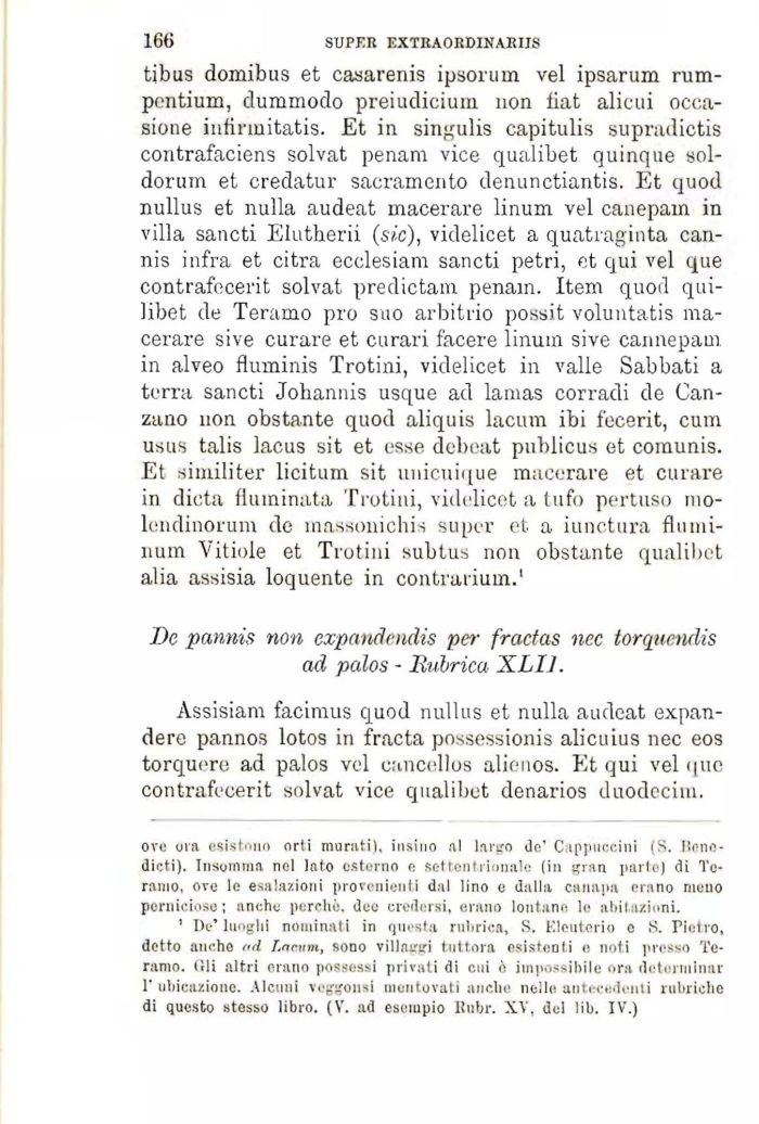 tibus domibus et casarenis ipsorum vel ipsarum rum-pentium, dummodo preiudicium non liat alicui occasione iufirmitatis. Et in singulis capitulis supradictis contrafaciens solvat penam vice qualibet quinque soldorum et credatur sacramento denunctiantis. Et quod nullus et nulla audeat macerare linum vel canepam in villa sancti Elutherii (sic), videlicet a quatraginta can-nis infra et citra ecclesiam sancti petri, et qui vel que contrafecerit solvat predictam penam. Item quorl qui-libet de Teramo prò suo arbitrio possit voluntatis macerare sive curare et curari facere linum sive cannepam in alveo fluminis Trotini, videlicet in valle Sabbati a terra sancti Johannis usque ad lamas Corradi de Ganzano non obstante quod aliquis lacum ibi fecerit, cum usus talis lacus sit et esse debeat publicus et comunis. Et similiter licitum sit unicuique macerare et curare in dieta fluminata Trotini, videlicet a tufo pertuso ino-lendinorum de massonichis super et a iunctura flumi-num Vitiole et Trotini subtus non obstante qualibet alia assisia loquente in contrarium.1