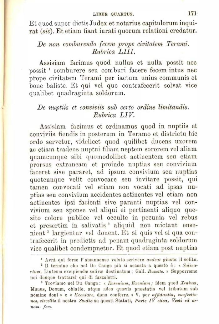 Assisiam facimus et ordinamus quod in nuptiis et conviviis fiendis in posterum in Teramo et districhi hic orcio servetur, vidclicet quod quilibet ducens uxorein ac etiam tradens nuptui filiain neptem sororem vel aliam quamcunque sibi quomodolibet actinentem seu etiam prorsus extraneam et proinde nuptias seu convivium laceret sive pararci, ad ipsum convivium seu nuptias quotcunque velit convocare seu invitare possit, qui tamcn convocati vel etiam non vocati ad ipsas nuptias seu convivium accidentes actinentes vel etiam non actinentes ipsi facienti sive paranti nuptias vel convivium seu sponse vel aliqui ei pertinenti aliquo quesito colore publice vel occulte in pecunia vel rebus et presertim in salivatis. ' aliquid non mictant ensc-nient3 largientur vel donent. Et si quis vel si qua contrafecerit in predictis ad penam quadraginta soldorum vice qualibet condempnetur. Et quod etiam post nuptias