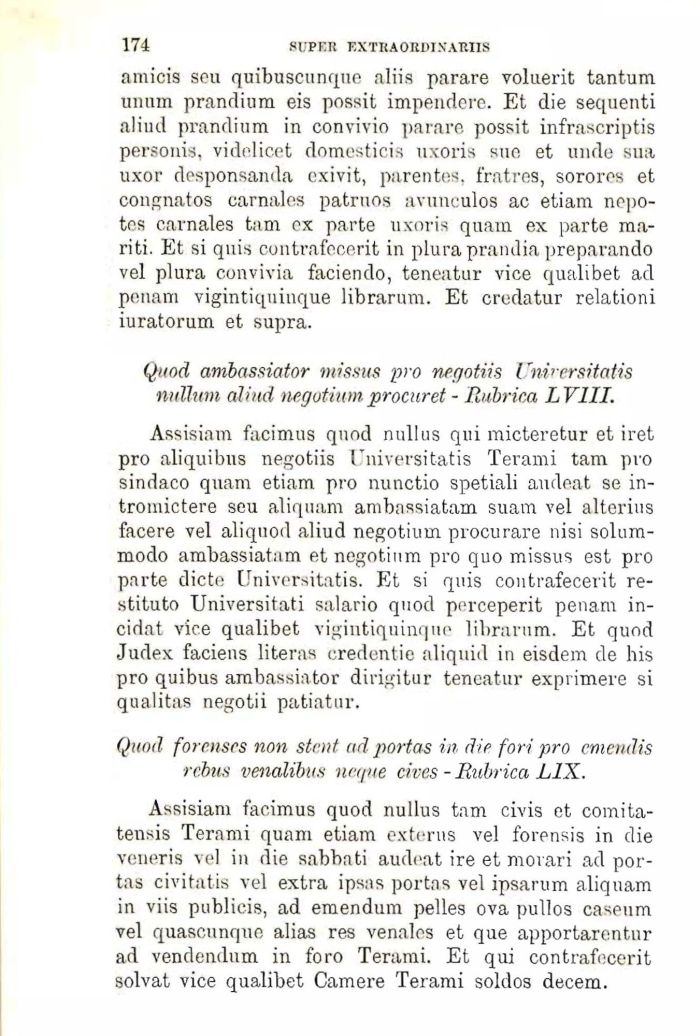 Assisiam facimus quod nullus qui micteretur et iret prņ aliquibns negotiis rniversitatis Terami tam prņ sindaco quam etiam prņ nunctio spetiali audeat se in-tromictere seu aliquam ambassiatam suam vel alterius facere vel aliquod aliud negotium procurare nisi solum-modo ambassiatam et negotium prņ quo missus est prņ parte cģicte Universitatis. Et si quis contrafecerit restituto Universitati salario quod perceperit penam in-cidat vice qualibet vigintiquinque librarum. Et quod Judex faciens literas credentie aliquid in eisdem de his prņ quibus ambassiator dirigitur teneatur exprimere si qualitas negotii patiatur.
