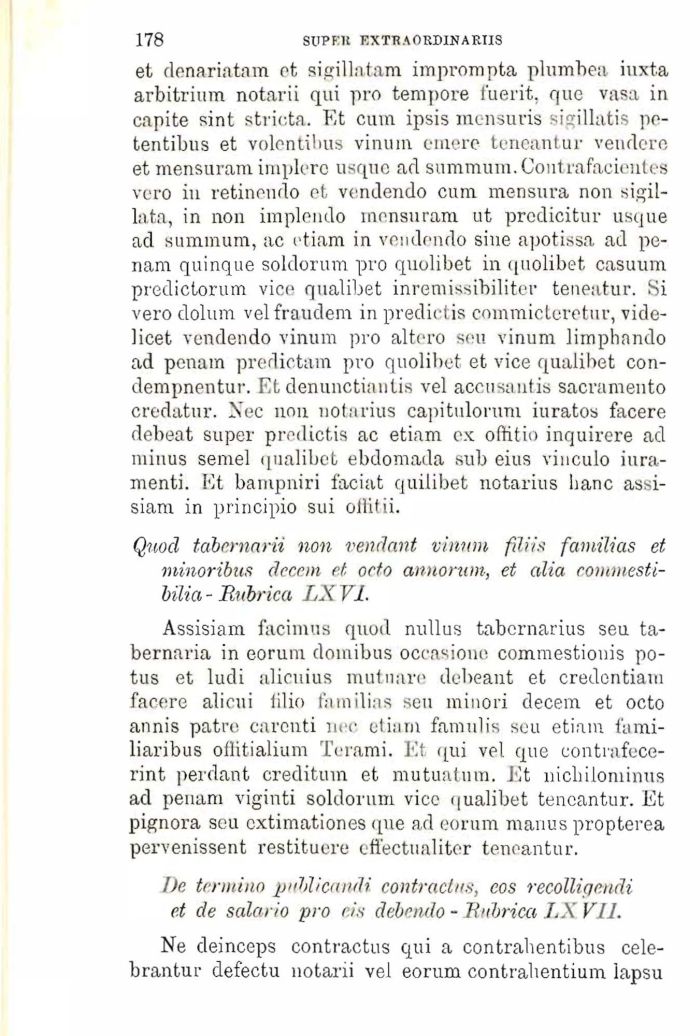 et denariatam et sigillatam imprompta plumbea iuxta arbitrium notarii qui prò tempore fuerit, que vasa in capite sint stricta. Et cum ipsis mensuris sigillatis po-tentibus et volentilius vinnin emerc teneantur vendere et mensuram imploro usque ad summum.Goutrafacientes vero in retineudo et vendendo cum mensura non sigillata, in non implondo mensuram ut prcdicitur usque ad summum, ac etiam in vendendo sine apotissa ad penam quinque soldorum prò quolibet in quolibet casuum predictorum vice qualibet inremissibiliter teneatur. Si vero clolum velfraudem in predictis commicteretur, videlicet vendendo vinum prò altero seu vinum limphando ad penam predictam prò quolibet et vice qualibet con-dempnentur. Et denunctiantis vel accusanti» sacramento credatnr. Nec non notarius capitulorum iuratos facere debeat super predictis ac etiam ex oftitio inquirere ad minus semel qualibet ebdomada sub eius vinculo iura-menti. Et banipniri faciat quilibet notarius hanc assisiam in principio sui oilifii.