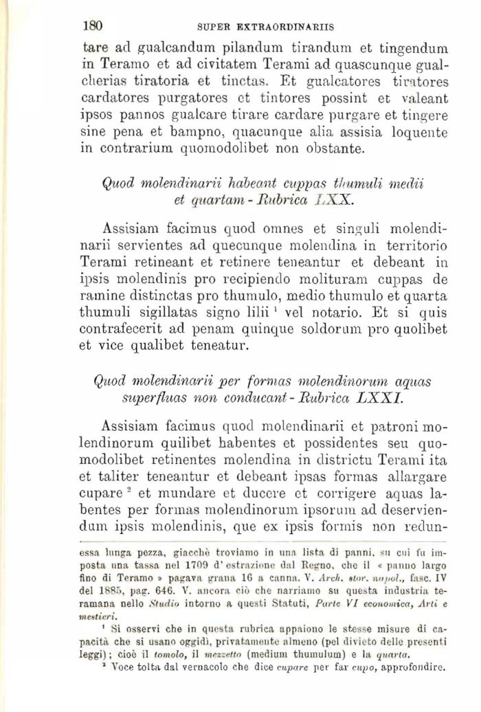 Assisiam facimus quod omnes et singuli molendinarii servientes ad quecunque molendina in territorio Terami retineant et retinere teneantur et debeant in ipsis molendinis prò recipiendo molituram cuppas de ramine distinctas prò tbumulo, medio thumulo et quarta tbumuli sigillatas signo lilii 1 vel notario. Et si quis contrafecerit ad penam quinque soldorum prò quolibet et vice qualibet teneatur.