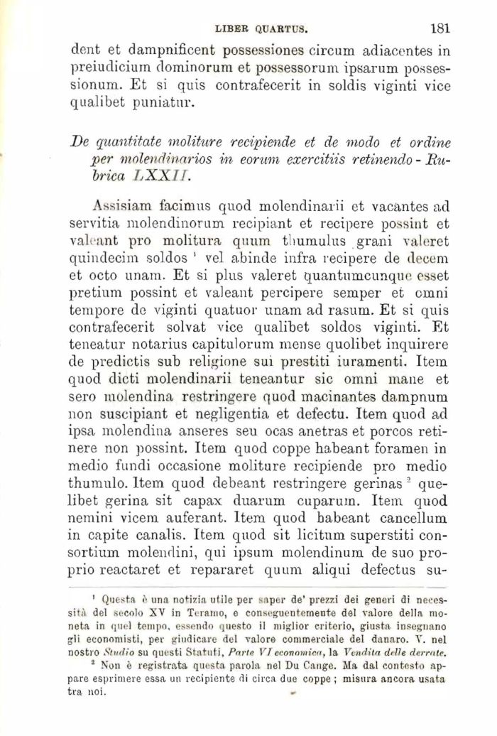 1 Questa è una notizia utile per saper de' prezzi dei generi di necessità del secolo XV in Teramo, o conseguentemente del valore della moneta in quel tempo, essendo questo il miglior criterio, giusta insegnano gli economisti, per giudicare del valore commerciale del danaro. A', nel nostro Studio su questi Statuti, Porte VI economica, la Vendita dille derrate.