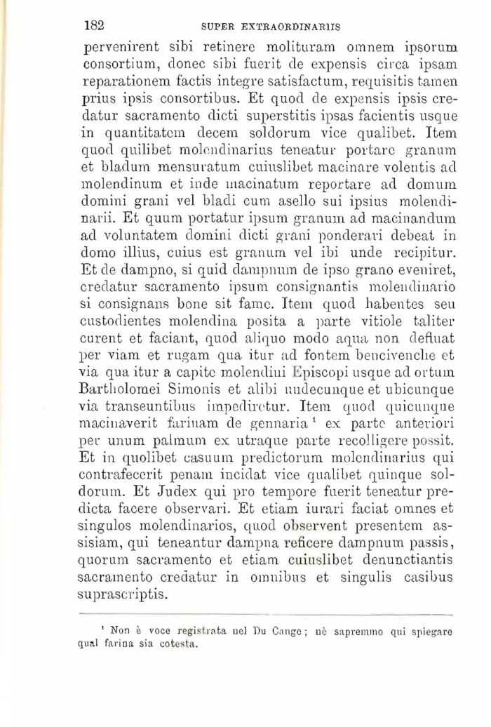 pervenirent sibi retinere raolituram omnem ipsorum consortium, clonec sibi fuerit de expensis circa ipsam reparationem factis integre satisfactum, requisitis tamen prius ipsis consortibus. Et quod de expensis ipsis cre-datur sacramento dicti superstitis ipsas facientis usque in quantitatcm decem soldorum vice qualibet. Item quod quilibet molcndinarius teneatur portare granum et bladum mensuratum cuiuslibet macinare volentis ad molendinum et inde macinatum reportare ad domum domini grani vel biadi cum asello sui ipsius molendi-narii. Et quum portatur ipsum granum ad macinandum ad voluntatem domini dicti grani ponderali debeat in domo illius, cuius est granum vel ibi unde recipitur. Et de dampno, si quid dampnum de ipso grano eveniret, credatur sacramento ipsum consignantis molendinario si consignans bone sit fame. Item quod habentes seu custodientes molendina posita a ])arte vitiole taliter curent et faciant, quod aliquo modo aqua non defluat per viam et rugam qua itur ad fontem bencivenclie et via qua itur a capite molendiui Episcopi usque ad ortum Bartholoraei Simonis et alibi uudecunque et ubicunque via transeuntibus impediretur. Item quod quicunque macinaverit fariuam de gennaria1 ex parte anteriori per unum paimum ex utraque parte recolligere possit. Et in quolibet casuum predictorum molcndinarius qui contrafecerit penam incidat vice qualibet quinque soldorum. Et Judex qui prò tempore fuerit teneatur predicta facere observari. Et etiam iurari faciat omnes et singulos molendinarios, quod observent presentem assisiam, qui teneantur dampna reficere dampnum passis, quorum sacramento et etiam cuiuslibet denunctiantis sacramento crecìatur in omnibus et singulis casibus suprascriptis.