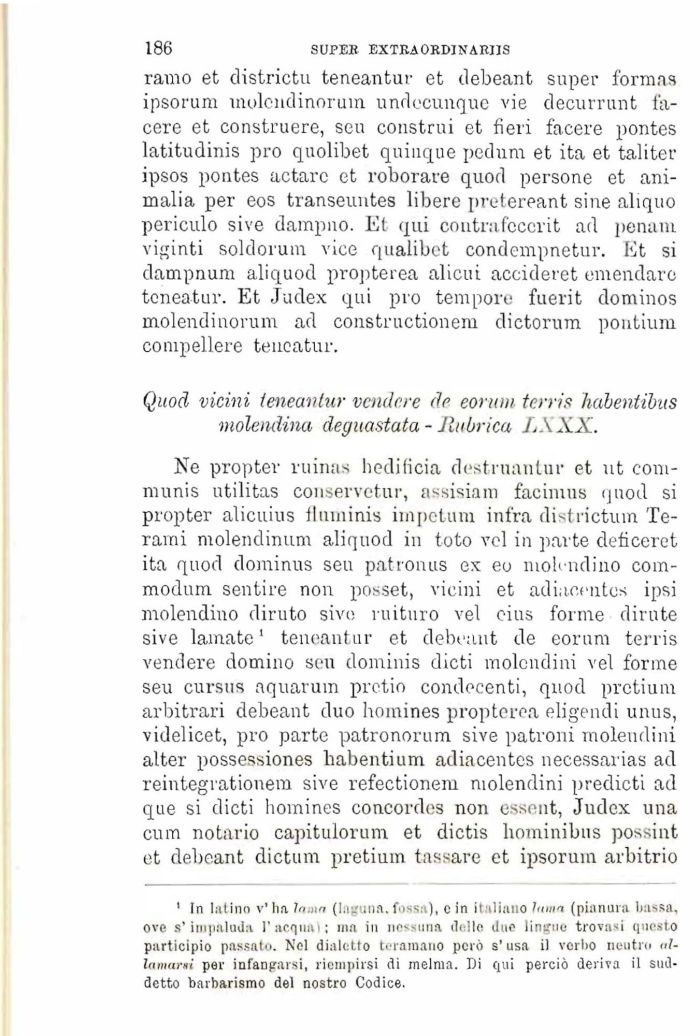 Ne propter vuinas hedificia destruantur et ut com-munis utilitas conservetur, assisiam facimus quod si propter alicuius lluminis iinpetum infra districtum Te-rami molendinum aliquod in toto vel in parte deticeret ita quod dominus seu patronus ex eo molendino com-modum sentire non posset, vicini et adiacente* ipsi molendino diruto sive ruituro vel eius forme dirute sive lamate1 teneantur et debeant de eorum terris vendere domino seu dominis dicti molcndini vel forme seu cursus aquarum prctio condecenti, quod pretium arbitrari debeant duo hoinines propterea eligendi unus, videlicet, prò parte patronorum sive patroni molendini alter possessiones habentium adiacentes necessarias ad reintegratiouem sive refectionem molendini predicti ad que si dicti homines concordes non esseut, Judex una cum notario capitulorum et dictis hominibus possint et debeant dictum pretium tassare et ipsorum arbitrio