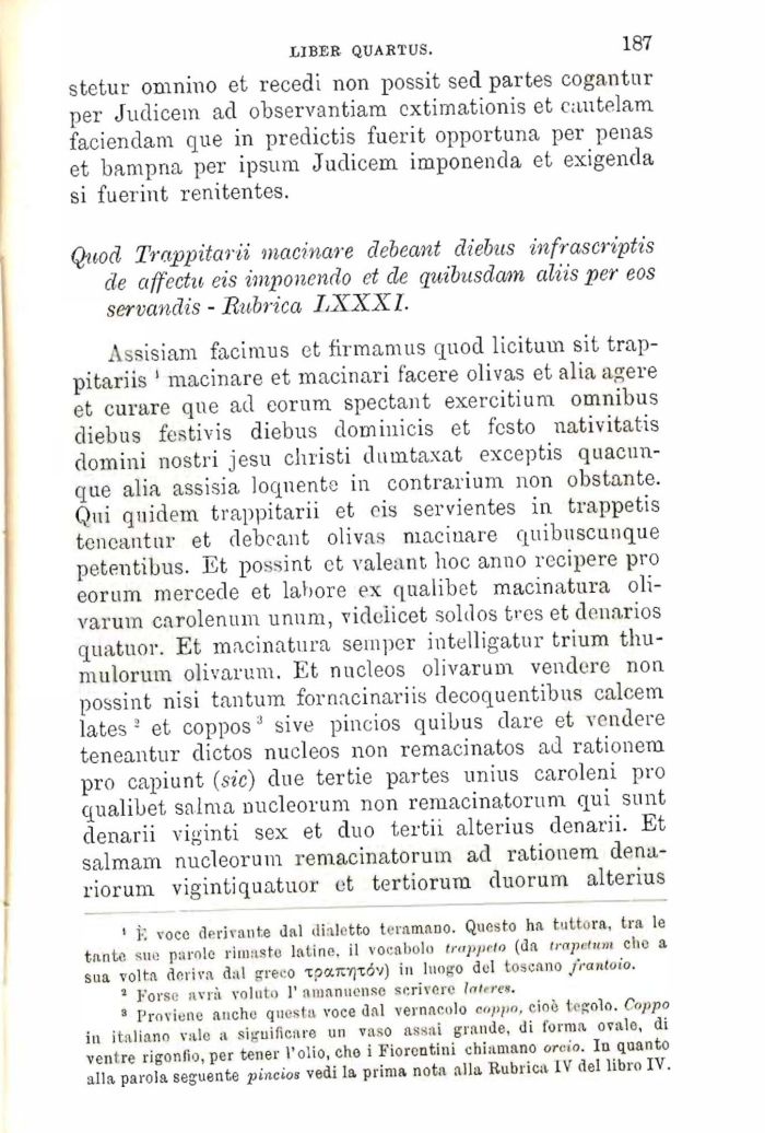 Assisiam facimus et firmamus quod licitum sit trap-pitariis ' macinare et macinari facere olivas et alia agere et curare que ad eorum spectant exercitium omnibus diebus festivis diebus domiuicis et fcsto nativitatis domini nostri jesu christi dumtaxat exceptis quacun-que alia assisia loqnente in contrarium non obstante. Qui quidein trappitarii et eis servientes in trappetis teneantur et debeant olivas macinare quibuscunque petentibus. Et possint et valeant hoc anno recipere prò eorum mercede et labore ex qualibet macinatura oli-varum carolenum unum, videlicet soldos tres et denarios quatuor. Et macinatura semper intelligatur trium thu-mulorum olivarum. Et nucleos olivarum vendere non possint nisi tantum fornacinariis decoquentibus calcem lates 2 et coppos3 sive pincios quibus dare et vendere teneantur dictos nucleos non remacinatos ad rationem prò capiunt (sic) due tertie partes unius caroleni prò qualibet salma nucleorum non remacinatorum qui sunt denarii viginti sex et duo tertii alterius denarii. Et salmam nucleorum remacinatorum ad rationem dena-riorum vigintiquatuor et tertiorum duorum alterius