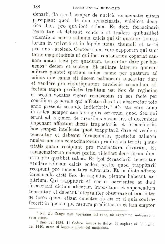 denarii, ita quod semper de nucleis remaciriatis minus percipiant quod de non remacinatis, videlieet denarios duos pio qualibet salma. Et dicti fornacinarii teneantur et debeant vendere et tradere quibuslibet volentibus emere salniam calcis qui sit quatuor tliumu-lorum in pulvere et in lapide unius thumuli et tertii prò uno earoleno. Centonarium vero cupporum qui sunt tante magnitudinis ut quilibet centonarius coperiat can-nam unam teeti per quadrum, teneantur dare per blo-nenos 1 decem et septem. Et miliare laf rum quorum miliare plantet spntium unius canne per quatrum ad minus (pie canna sit decem palmorum teneantur dare et vendere pio vigintiquatuor carolenis secundum af-fectuni supra predictis traditum per Sex de regimine et secum vocatos vigore remissionis in eos facte per consilium generale qui affectus duret et observetur toto anno presenti secunde Indictionis.! Ab isto vero anno in antea semper annis singulis servetur, quod Sex qui erunt ad regimen de mensibus novembris et deceinbris imponant atfoctum dictis trappetariis et fornacinariis hoc semper intellecto quod trappitarii dare et vendere teneantur et debeant fornacinariis predictis salniam nueleorum non reniacinatorum prò duabus tertiis quan-' titatis quam recipiunt prò macinatura olivarum. Et remaeinatoruin minori pretio, videlieet denariorum duo-rum prò qualibet salma. Et ipsi fornaciarii teneantur vendere salniam calcis eodem pretio quod trappitarii recipiunt prò macinatura olivarum. Et in dieto affecto imponendo dicti Sex de regimine plenum babeant arbitrium. Qui trappitarii et eorum servientes et dicti fornaciarii dictum affectum impositum et imponendutn teneantur et debeant inteuraliter observare et tam inter se ipsos quam etiam omentes ab eis et si quis contrafecerit in quocunque casuum prcdictoruni et tain einptor