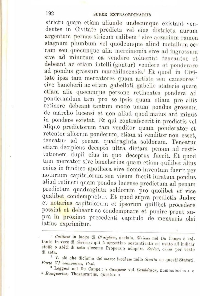 strictu quam etiam aliutide undecunque existant ven-dentes in Civitate predicta vel eius districhi aurum argentimi pernas siricum calibem sive aezarium ramen stagnum pliimbuin voi quodcunque aliud metalluni cernili seu quecunque alia mercimonia sive ad ingrossimi sive ad minutuin ea vendere voìuerint teneantur et debeant ac etiam intolli (gantur) vendere et ponderare ad pondus grossum marcbilucensis.' Et quod in Civitate ipsa tam mercatore* quain artiste seu camsoros 3 sive bancherii ac etiam gabelloti gabello staterie quam etiam alie quecunque persone retinentes pondera ad ponderandum tam prò se ipsis quam etiam prò aliis retinere debeant tantum modo unum pondus grossum de marcilo Incensi et non aliud quod maius aut minus in pondere existat. Et qui contrafecerit in predictis vel aliquo predictorum tam venditor quam ponderator et retentor aliorum ponderum, etiam si venditor non esset, teneatur ad penam quadraginta soldorum. Teneatur etiam decipiens decepto ultra dictam penam ad resti-tutionem dupli eius in quo deceptus fuerit. Et quod tam mercator sive banclierius quam etiam quilibet alius cuius in f'undico apotheca sive domo inventum fuerit per notarium capitulorum seu visum fuerit iuratum pondus aliud retineri quam pondus luceuse predietum ad penam predictam quadraginta soldorum pio quolibet et vice qualibet condempnetur. Et quod supra predictis Judex et notarius capitulorum et ipsorum quilibet procedere possint et debeant ac coudempnare et punire prout supra in proximo precedenti capitulo de mensuris olei latins exprimitur.