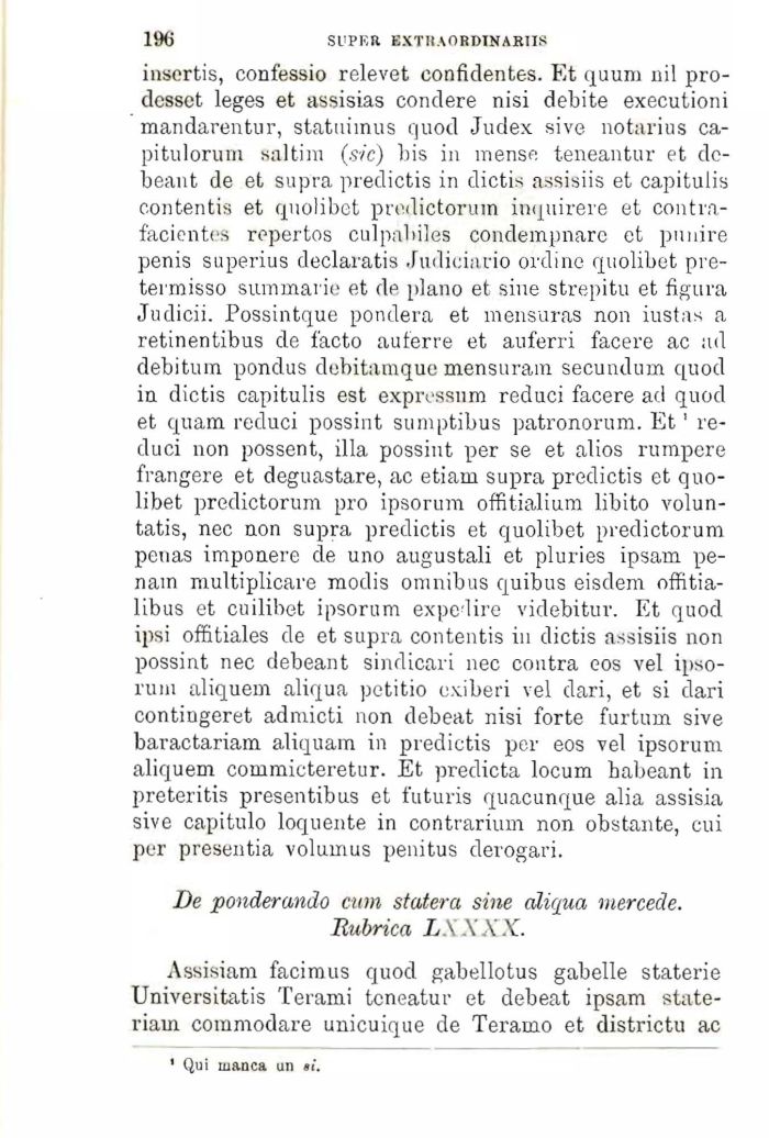 insertis, confessio relevet confklentes. Et quum nil pro-dcssct leges et assisias concģere nisi debite executioni mandarentur, statuiinus quod Judex sive notarius ca-pitulorum saltim (sic) bis in mense teneantur et de-beant de et supra predictis in dictis assisiis et capitulis contentis et quolibet predictorum inquirere et contra-facientes repertos culpabiles condempnare et punire penis superius declaratis Judiciario ordine quolibet pre-termisso summarie et de plano et sine strepitģi et figura Judieii. Possintque pondera et mensuras non iustas a retinentibus de facto auferre et auferri facere ac ad debitum pondus debitamque mensuram secundum quod in dictis capitulis est expressum reduci facere ad quod et quam reduci possint sumptibus patronorum. Et ' reduci non possent, illa possint per se et alios rumpere frangere et deguastare, ac etiam supra predictis et quolibet predictorum prņ ipsorum offitialium libito volun-tatis, nec non supra predictis et quolibet predictorum penas imponere de uno augustali et pluries ipsam penam multiplicare modis omnibus quibus eisdem offitia-libus et cuilibet ipsorum expedire videbitur. Et quod ipsi offitiales de et supra contentis in dictis assisiis non possint nec debeant sindicari nec contra eos vel ipsorum aliquem aliqua petitio exiberi vel dari, et si dari contingeret admicti non debeat nisi forte furtum sive baractariam aliquam in predictis per eos vel ipsorum aliquem commicteretur. Et predicta locum babeant in preteritis presentibus et futuris quacunque alia assisia sive capitulo loquente in contrarium non obstante, cui per presentia volumus penitus derogari.