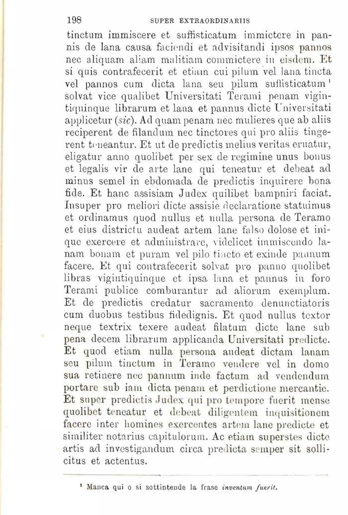 tinctum immiscere et sufģisticatum immictere in pan-nis de lana causa faciendi et advisitandi ipsos pannos nec aliquam aliam malitiam commictere in eisdem. Et si quis contrafecerit et etiam cui pilum vel lana tineta vel pannos cum dieta lana seu pilum sufģisticatum1 solvat vice qualibet Universitari Terami penam vigin-tiquinque librarum et lana et pannus diete Universitari applicetur (sic). Ad quam penam nec mulieres que ab aliis reciperent de fi land uni nec tinctores qui pio aliis tinge-rent teneantur. Et ut de predictis melius veritas eruatur, eligatur anno quolibet per sex de regimine unus bonus et legalis vir de arte lane qui teneatur et debeat ad minus semel in ebdomada de predictis inquirere bona fide. Et hanc assisiam Judex quilibet bampniri faciat. Insuper prņ meliori diete assisie declaratione statuimus et ordinamus quod nullus et nulla persona de Teramo et eius districtu audeat artem lane falso dolose et inique exercere et administrarc, videlicet immiscondo la-nam bonam et purani vel pilo ti.icto et exinde paunum facere. Et qui contrafecerit solvat prņ panno quolibet libras vigiutiquinque et ipsa lana et pannus in foro Terami publice comburantur ad aliorum exemplum. Et de predictis credatur sacramento denunctiatoris cum duobus testibus fidedignis. Et quod nullus textor neque textrix texere audeat filatum diete lane sub pena decem librarum applicanda Universitati predicte. Et quod etiam nulla persona audeat dictam lanam seu pilum tinctum in Teramo vendere voi in domo sua retinere nec pannum inde faetnm ad vendendum portare sub iam dieta penam et perdictione niercantie. Et super predictis Judex qui prņ tempore fuerit mense quolibet teneatur et debeat diligentem inquisitionem facere inter bomines exerceutes artem lane predicte et similiter notarius capitulorum. Ac etiain superstes diete artis ad investigandum circa predicta semper sit solii-citus et actentus.