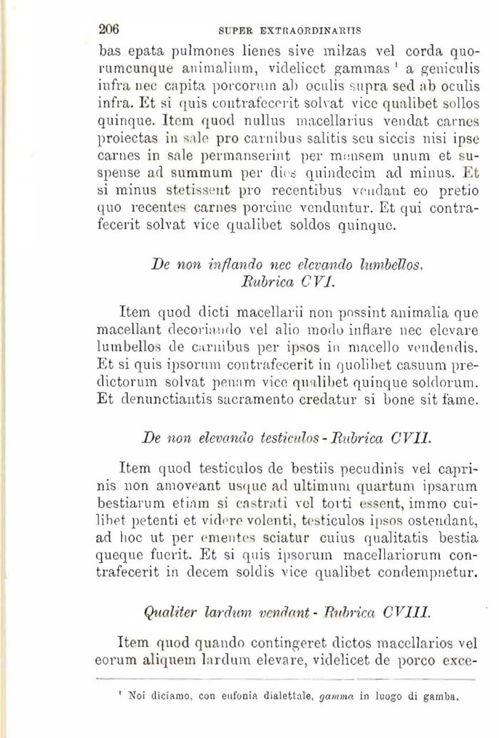 bas epata pulmones lienes sive milzas vel corda quo-rumcunque ammalium, videlicct gammas 1 a geniculis infra nec capita porcoriun ab oculis supra sed ab oculis infra. Et si quis contrafecerit solvat vice qualibet sollos quinque. Item quod nullus macellarius veudat carnes proiectas in sale prò carnibus salitis seu siccis nisi ipso carnes in sale permanserint per mensem unum et suspense ad summum per dies quindecim ad minus. Et si minus stetissent prò recentibus vendant eo pretio quo recentes carnes porcine venduntur. Et qui contrafecerit solvat vice qualibet soldos quinque.