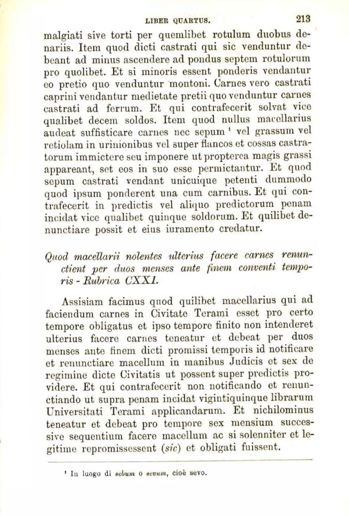 malgiati sive torti per quemlibet rotulum duobus de-nariis. Item quod dicti castrati qui sic venduntur debeant ad minus ascendere ad pondus septem rotulorum prņ quolibet. Et si minoris essent ponderis vendantur eo pretio quo venduntur montoni. Carnes vero castrati caprini vendantur medietate pretii quo venduntur carnes castrati ad fcrrum. Et qui contrafecerit solvat vice qualibet decem soldos. Item quod nullus macellarius audeat suffisticare carnes nec sepum 1 vel grassum vel retiolam in urinionibus vel super flancos et cossas castra-torum immictere seu imponere ut propterea magis grassi appareant, set eos in suo esse permictantur. Et quod sepum castrati vendant unicuique petenti dummodo quod ipsum ponderent una cum carnibus. Et qui contrafecerit in predictis vel aliquo predictorum penam incidat vice qualibet quinque soldorum. Et quilibet de-nunctiare possit et eius iuramento credatur.