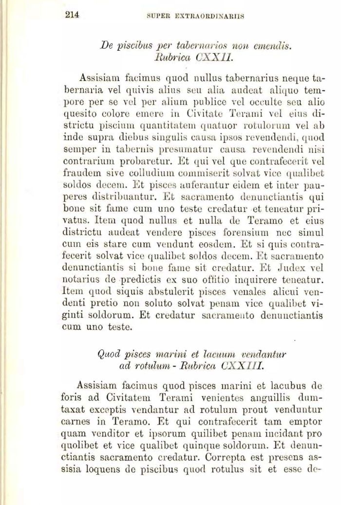 Assisiam facimus quod nullus tabernarius neque ta-bernaria vel quivis alius seu alia audeat aliquo tempore per se vel per alium publice vel occulte seu alio quesito colore emere iu Civitate Terami vel eius di-strictu piscium quruititatem quatuor rotulorum vel ab inde supra diebus singulis causa ipsos reveudendi. ([iiod semper in tabernis presuinatur causa reveudendi nisi contrarium probiiretur. Et qui vel que contrafecei'it vel fraudem sive colludami comniiserit solvat vico qualibet soldos decem. Et pisces auferantur eidem et inter pau-peres distribuantur. Et sacramento denunctiantis qui bone sit fame cum uno teste credatur et teneatur pri-vattis. Item quod nullus et nulla de Teramo et eius districtu audeat vendere pisces forensium nec simul cum eis sture cum vendunt eosdem. Et si quis contrafecerit solvat vice qualibet soldos doccili. Et sacramento denunctiantis si bone fame sit credatur. Et Judex vel notarius de predictis ex suo offitio inquirere teneatur. Item quod siquis abstulcrit pisces vouales alicui vendenti pretio non soluto solvat penam vice qualibet vigiliti soldorum. Et credatur sacramento denunctiantis cum uno teste.