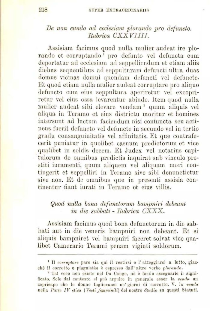 Assisiam facimus quod nulla mulier audeat ire plorando et corruptando ' prò defunto vel defuncta cum deportatili' ad ecclesiam ad seppellienduni et etiam aliis diebus sequentibus ad seppulturam defuucti ultra duas domus viciuas doniui quondam defuncti vel detenete. Et quod etiam nulla mulier audeat eorruptare prò aliquo defuncto cum eius seppultura aperiretur vel exeopri-retur vel eius ossa levarentur abiude. Item quod nulla mulier audeat sibi elevare vendam ! quum aliquis vel aliqua in Teramo et eius districtu moritur et hoiniues intersuut ad luetuni laciendum nisi coniuncta seu acti-nens fuerit defuncto vel defuncte in seeundo vel in tertio gradii consanguinitatis vel affinitatis. Et (pie contrafecerit puniatur in quolibet easuum predictorum et vice qualibet in soldis decem. Et Judex vel notarius capitulorum de omnibus predictis inquirat sub vinculo prestiti iuramenti, quum aliquem vel aliquam mori eon-tingerit et seppelliri in Teramo sive sibi denunctictur sive non. Et de omnibus (pie in presenti assisia con-tiuenlu r iiaut iurali in Teramo et eius villis.