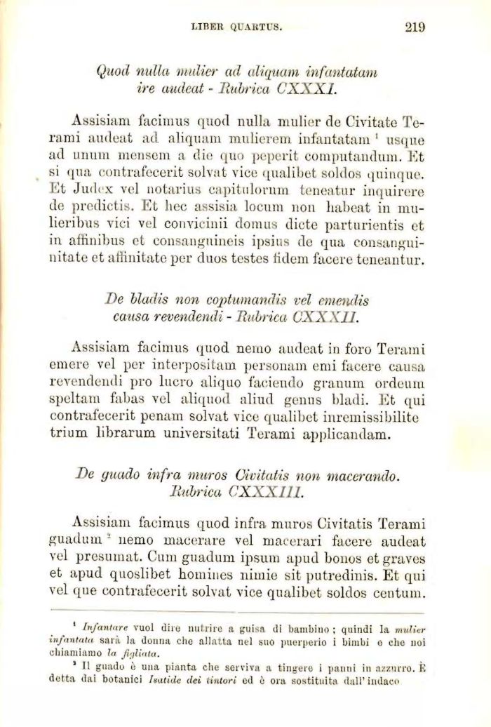 Assisiam facimus quod nulla niulier do Civitate Te-rami audeat ad aliquam muliereiu infantatam 1 usque ad unum monsoni a die quo peperit. computaiulum. Et si qua contrafecerit solvat vico qualibet soldos quinque. Et Judex voi uotarius capitulorum teneatur inquirere do predictis. Et liec assisia locum non habeat in mu-lieribus vici vel convicinii domus diete parturientis et in affiliibus et consanguineis i]>sius do qua consangui-nitato et affinitate per duos testes fidem facere teneantur.