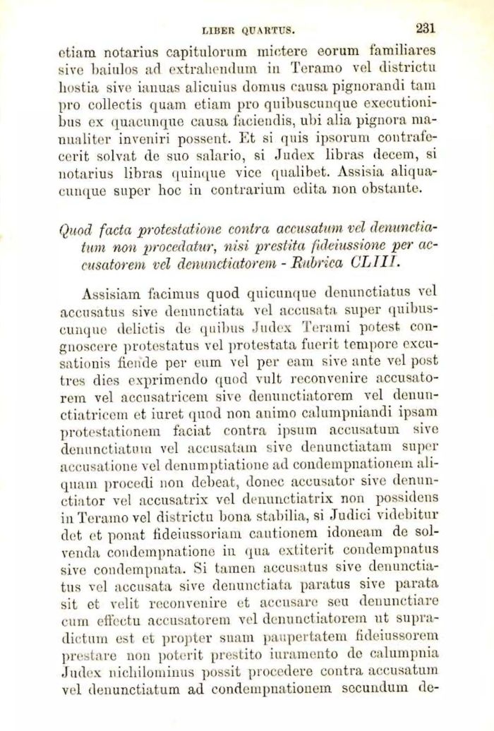 Assisiam facimus quod quicuuque denunctiatus vel aceusatus sive denunctiata vel accusata super quibus-cunque delictis de quibus Judex Terami potest con-gnoscore ])fotestatus vel protestata fuerit tempore cxcu-sationis fiorirle per eum vel per eam sive ante voi post tres dies exprimendo quod vult reconvenire accusato-rem vel accusatricem sive denunctiatorem vel denuu-ctiatriccm et iuret quod non animo caluinpniandi ipsam protestationem faciat contra ipsum accusatum sive denunctiatuui vel accusatam sive denunctiatam super accusatione vel denumptiatione ad condempnationem ali-qnam procedi non debeat, donec accusator sivo denun-ctiator vel accusatrix voi denunctiatrix non possideus in Teramo vel districtu bona stabilia, si Judici videbitur dot et ponat fideiussoriam cautionem idoneam do sol-venda condempnationo in qua extiterit condempnatus sive condempnata. Si tamen accusatus sive denunctiatus vel accusata sive denunctiata paratus sive parata sit et velit reconvenire et accusare seu deuunctiare cum effectu accusatorem vel denunctiatorem ut supra-dictum est et propter snam paupertatem fideiussorem prestare non poterit prestito iuramento de calumpnia Judex nichilomiuus possit procedere contra accusatum vel denunctiatum ad condempnationem socundum do-