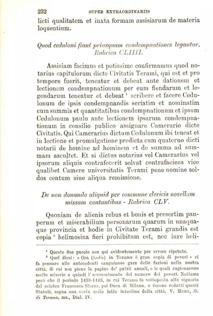 * Quel dirsi : • Ora (hodie) in Teramo e gran copia di poveri » ci fa pensare alle antecedenti sanguinose gare delle fazioni nella nostra città, di cui son piene lo pagine de' patrii annali, e le quali cagionarono molte miserie e quindi, l'accrescimento del numero dei poveri. Notiamo però che il periodo 1438-1143, in cui Teramo fu sottoposta alla signoria del celebre Francesco Sforza, poi Duca di Milano, e furono redatti questi Statuti, segna una s .sia nelle lotto intestino della città. V. Mirati, Si. di Teramo, 111s., Dial. IV.