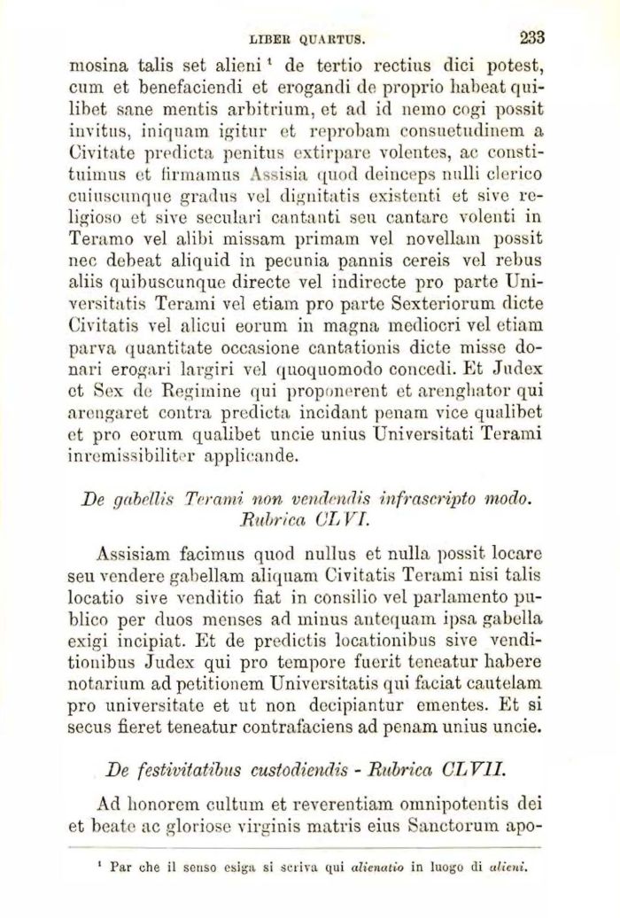 niosina talis set alieni4 de tertio rectius dici potest, cum et benefacienrli et erogandi de proprio habeat qui-libet sane mentis arbitrium, et ad id neirio cogi possit invitus, iniquam igitur et reprobani consuetudinem a Civitate predicta penitus estirpare volentes, ac consti-tuimus et lirmamas Assisia quod deinoeps nulli clerico cuiuscunque gradus vel dignitatis esistenti et sive religioso et sive seculari cantanti seu cantaro volenti in Teramo vel alibi missam primam vel novellam possit nec debeat aliquid in pecunia pannis cereis vel rebus aliis quibuscunquc directe vel indirecte prņ parte Uni-versitatis Terami vel etiam prņ parte Sexteriorum diete Civitatis vel alicui eorum in magna mediocri vel etiam parva quantitate occasione cantationis diete missc do-nari erogari largiri vel (pioquomodo concedi. Et Judex et Sex de Regimine qui proponerent et arengliator qui arengaret contra predicta incidant penam vice qualibct et prņ eorum qualibet uncie unius Universitati Terami inremissibilitT applicande.