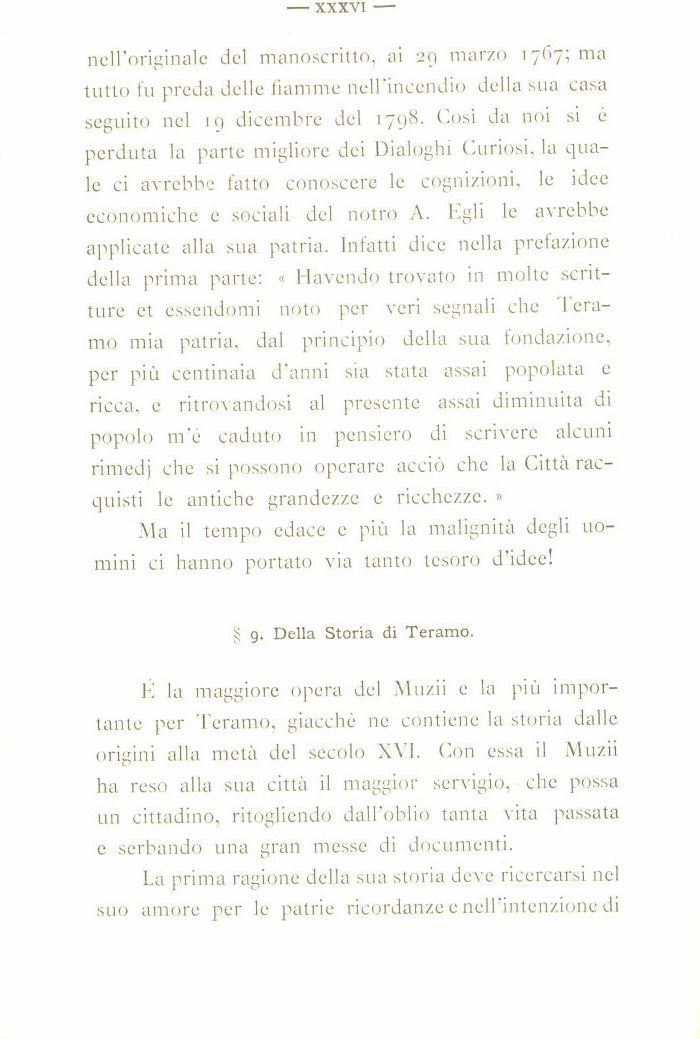 nell'originale del manoscritto, ai 29 marzo 1767; ma tutto fu preda delle fiamme nell'incendio della sua casa seguito nel 19 dicembre del 1798. Così da noi si è perduta la parte migliore dei Dialoghi Curiosi, la quale ci avrebbe fatto conoscere le cognizioni, le idee economiche e sociali del notro A. Egli le avrebbe applicate alla sua patria. Infatti dice nella prefazione della prima parte: « Havendo trovato in molte scritture et essendomi noto per veri segnali che Teramo mia patria, dal principio della sua fondazione, per più centinaia d'anni sia stata assai popolata e ricca, e ritrovandosi al presente assai diminuita di popolo m'è caduto in pensiero di scrivere alcuni rimedj che si possono operare acciò che la Città rac-quisti le antiche grandezze e ricchezze. »