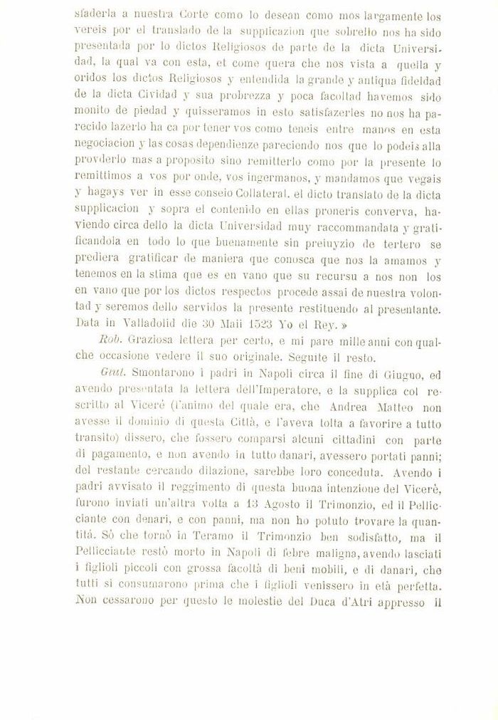 sfaderla a nuestra Corte corno lo desean conio mos largamente los vereis por el translado de la suppticazion que sobrello nos ha sido presentada por lo dictos Religiosos de parte de la dieta Universi, dad, la qual va con està, et come quera che nos vista a quella y oridos los dictos Religiosos y entendida la grande y antiqua fideldad de la dieta Cividad y sua probrezza y poca facoltad havemos sido monito de piedad y quisseramos in esto satisfazerles no nos ha pa-recido lazerlo ha ca por tener vos conio teneis elitre manos en està negociacion y las cosas dependienze pareciendo nos que lo podeisalla provderlo mas a proposito sino remitterlo corno por la [iresente lo remittimos a vos por onde, vos ingermanos, y mandamos que vegais y hagays ver in esse conseio Collateral. el dicto translato de la dieta supplicacion y sopra el contenido en ellas proneris converva, ha-viendo circa dello la dieta Universidad riiuy raccommandata y gratificandola en todo lo que buenamente sin preiuyzio de tertero se prediera gratificar de maniera que conosca que nos la amainos y tenemos en la stima que es en vano que su recursu a nos non los en vano que por los dictos respectos procede assai de nuestra volon-tad y seremos dello servidos la presente restituendo al presentante. Data in Valladolid die 30 Maii 1523 Yo el Rey. »